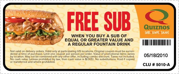 For a few days longer, take your printable coupon into any Quiznos location to get a free sub when you purchase another sub and a drink. Offer ends May 18, 2010.